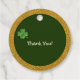 Miniatur Leprechaun in 3D + "Happy St Patrick's Day" in einen grünen Kreis + Vintag St Patrick's Day Postkarte als Hintergrund mit "Danke!" hinten. Design auf dem Round-Gvor-Tag-Tag.