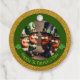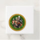 Miniatur Leprechaun in 3D + "Happy St Patrick's Day" in einen grünen Kreis + Vintag St Patrick's Day Postkarte als Hintergrund mit "Danke!" hinten. Design auf dem Round-Gvor-Tag-Tag.