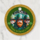 Miniatur Leprechaun in 3D + "Happy St Patrick's Day" in einen grünen Kreis + Vintag St Patrick's Day Postkarte als Hintergrund mit "Danke!" hinten. Design auf dem Round-Gvor-Tag-Tag.