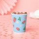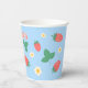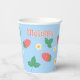 Eine niedliche Papiertasse, die auf einem weichen, himmelblauen Hintergrund ein reizvolles und spielerisches Muster verstreuter Mini-Erdbeeren aufweist. Die Erdbeeren werden mit grünen Blätter in kräftigem Rot gehalten, und sie sind mit kleinen, zarten, weißen oder hellgelben Erdbeeren-Blume vermischt, was den Charme noch verstärkt. Der Gesamteindruck wirkt fröhlich, frisch und süß, und ist somit ideal für Kinder.