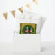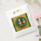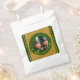 Miniatur Leprechaun in 3D + "Happy St Patrick's Day" in einem grünen Kreis + goldfarbenes Texturpapier (Bild gedruckt) als Hintergrund. Design auf Gunst Tasche.