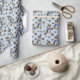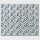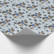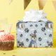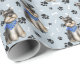Ein Bild eines grauen Miniatur Schnauzer Terrier Dog ist das Muster auf diesem jeder Anlass Geschenkpapier. Der Hund trägt einen blauen Schal und sitzt inmitten eines Musters von schwarzen Pfotendrucken und weißen Knochen. Das Bild wird auf einem silberblauen Hintergrund wiederholt.