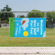 Kid's Minigolf putt Birthday Party Begrüßungsbanner-Zeichen. Spaß farbenfrohe Illustration für Kinder. Geeignet für Jungen und Mädchen. Sportliche Feste mit Aktivitäten für kleine Kinder. Ein schöner Minigolfplatz mit Fahne, Ball, Wolken und Sonne. Niedliche Typografie-Vorlage.