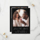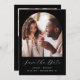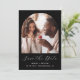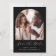 Diese schlichte, minimalistische Save the Date Karte verfügt über einen Boho-Foto-Bogen über den Worten "Save the Date" in eleganter Schrift, gefolgt von den Namen der Ehepaare, Hochzeitstag und Stadt in serifenlosen Sans-Schriftart auf schwarzem Hintergrund. Fügen Sie ein zweites, horizontales Foto und eine ausführlichere Nachricht mit zusätzlichen Informationen auf der Rückseite hinzu.