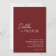 Modernes Bordeaux in einer Hochzeitseinladung mit einem schlichten und minimalen Design mit dem Namen der Braut in einem eleganten Drehbuch und dem Namen des Bräutigams in einem zeitgenössischen serifenlosen Schriftart. Unten unten rechts finden Sie Ihre Veranstaltungsdetails in minimalistischem Layout. Auf der Rückseite befinden sich Ihre zusätzlichen Details und QR-Code, sodass Sie die Gehäusekarte und die RSVP-Karte überspringen können.