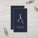 Elegante, individuell anpassbare Visitenkartenvorlage mit IMITATEN Metallschere und dunkelblauem Hintergrund. Perfekt für Haarstylisten, Friseursalons.
