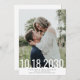 Hochzeit Speichern Sie die Date 12x18 Vertical Card mit einem einfachen, modernen Typografie-Design mit einem großen, dünnen Schriftart-Überlagerungsdatum auf Ihrem Foto, das Sie in die Vorlage hochladen und geben Sie Ihre Namen und den Ort der Hochzeit und das Datum für ein schnelles und einfaches Design, das mit jedem Thema, das Sie später wählen, funktioniert. Hintergrundfarben und Schriftart können nach Ihrem Farbschema bearbeitet werden. Sie können auf der Rückseite weitere Informationen oder zusätzliche Fotos hinzufügen.