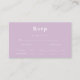 Machen Sie Ihre lässige Hochzeitsplanung mit unserer modernen lila RSVP-Karte zum Brennen. Diese schlichte und stilvolle Karte mit weißem Text auf einem weichen lila Hintergrund ist Teil unserer trendigen Hochzeitskollektion. Lass deinen Gästen einfach ihre Ernährungsgewohnheiten und UAWG mit Leichtigkeit. Vervollständigen Sie Ihr Hochzeitsgeschirr-Set mit unseren koordinierenden orangen und rosa Designs. UAWG jetzt für ein stressfreies Fest!