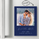 Diese einfache, minimalistische Save the Date Magnetkarte verfügt über ein quadratisches Foto über den Worten "Save the Date" in elegantem, weißem Schriftsatz, gefolgt von den Namen der Ehepaare, dem Hochzeitstag und der Stadt in sans serif Schriftart auf marinebasischem Hintergrund.