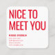 A minimal mini business card design with stylish large typograhy quote "hello" paired with your own name on front. Back says " nice to meet you " with a place to add your contact and business information. Designed in a modern mininalist style in clean simple red type on pink coral background. The perfect personalized business card. ©Marisu Valencia