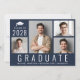 Minimal moderne dunkelblaue Abschluss-Ankündigung und Party Einladung mit einer 4-Foto-Collage, "Graduate" auf den Boden geschrieben in großen weißen Buchstaben und seine oder ihre Klasse Jahr, Name und Schule oder Universität in der einfachen weißen Typografie. Fügen Sie die Party-Details auf der Rückseite hinzu.