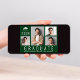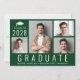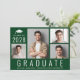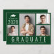 Minimal moderne grüne Abschluss Ankündigung und Party Einladung mit einer 4-Foto-Collage, "Graduate" auf den Boden geschrieben in großen weißen Buchstaben und die Graduate der Klasse Jahr, Name und Schule oder Universität in der einfachen weißen Typografie. Fügen Sie die Party-Details auf der Rückseite hinzu.