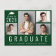 Minimal moderne grüne Abschluss-Ankündigung und Party Einladung-Postkarte mit einer 4-Foto-Collage, "Graduate" auf den Boden geschrieben in großen weißen Buchstaben und seine oder ihre Klasse Jahr, Name und Schule oder Universität in der einfachen weißen Typografie. Auf der Rückseite fügen Sie die Details der Graduierungsparty hinzu.