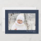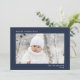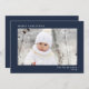 Elegante blaue Urlaubskarte mit einem minimalen Design mit Ihrem Foto und "Frohe Weihnachten", Ihrem Namen und dem Jahr in schlichter, moderner Weißtypografie.