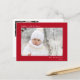 Elegante rote Urlaubspostkarte mit minimalem modernem Design mit Ihrem Foto und "Frohe Weihnachten", Ihrem Namen und dem Jahr in schlichter weißer Typografie. Auf der Rückseite fügen Sie ein zusätzliches Foto und Ihre personalisierte Begrüßung zu Familie und Freunden.