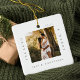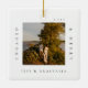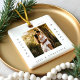 Minimal und modern schlicht Foto bewahren Foto-Ornament, um Ihre ersten Weihnachten verlobt zu gedenken. Das Design zeichnet sich durch ein schlichtes minimales Design mit einem quadratischen Foto-Design aus, um Ihr spezielles Verlobung-Foto anzuzeigen. "Verlobt & Merry", Jahr- und Paarname in einem schlichten, modernen Design rund um das Foto. Zwei Foto mit einem Foto auf der einen und einem zweiten Foto auf der anderen Seite des Ornaments.