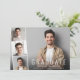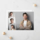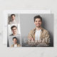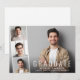 Minimal moderne Abschluss-Ankündigung Flachkarte mit dem Foto des Absolventen überlagert mit einem Streifen von drei kleineren quadratischen Fotos und "Graduate", ihren Namen, Schule und Klasse Jahr in schlicht weiß Typografie.