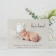 Minimal moderne Geburtsankündigung, um die Ankunft Ihres neuen Babys zu Familie und Freunden anzukündigen. Das Foto Ihres Neugeborenen füllt die Vorderseite und wird mit "sie ist hier!" "Er ist hier!" oder "Ich bin hier!" in einer zeitgenössischen Schrift überlagert (Sie können diesen Text je nach Foto in einen anderen Bereich auf der Karte verschieben, indem Sie "Design-Tool bearbeiten" auswählen). Geben Sie den Namen, das Ankunftsdatum und die Geburtsdaten ein. Auf der anderen Seite fügen Sie vier weitere Fotos hinzu, eine "Begrüßungsbotschaft" und die Vornamen der Eltern und Geschwister.
