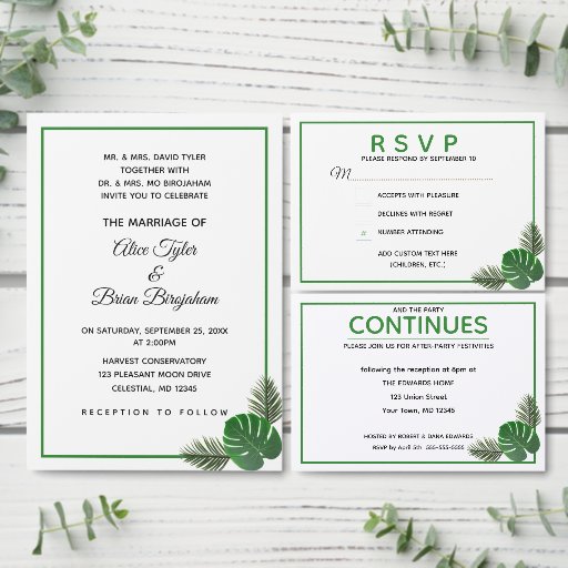 Diese Kollektion ist sauber, modern und elegant, mit topischen Palmenfronten und grünen Akzenten. Jedes Feld ist vollständig anpassbar, um genau zu sagen, was Sie gewollt haben! Eine vollständige Koordinationsabholung ist verfügbar.