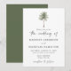 Tropische Hochzeitseinladungen mit einer Single-Palmenbildeur oben auf der Einladung. Die Palmen Hochzeit individuell zu gestalten lädt mit Ihren Namen und Hochzeitsdetails in schwarzer Schrift ein, die mit einem modernen, handgeschriebenen Skript das Design unterstreicht. Die einfache tropische Hochzeit lädt zu einem soliden grünen Hintergrund. Entworfen, um mit unserer Minimal Palm Tree Hochzeitskollektion zu koordinieren.