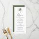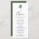 Tropisches Hochzeitsmenü mit einer Single-Palme an der Spitze des Designs mit "Menu" in einem modernen schwarzen Kalligraphie-Skript angezeigt. Das Palmen-Hochzeitsmenü mit Namen, Hochzeitsdatum und Speisekarte unten. Das Hochzeitsmenü am Strand wechselt zu einem dunkelgrünen Hintergrund mit Platz für zusätzliche Texte und Fotos. Entworfen, um mit unserer Minimal Palm Tree Hochzeitskollektion zu koordinieren.