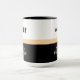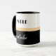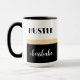 Hustle wie eine Bossbabe Tasse. Modernes, schicke Design mit fett formatierter Typografie auf schwarz-weißem Hintergrund geteilt durch einen Champagner mit goldfarbenem Rahmen. Personalisieren Sie die Tasse mit Ihrem Namen auf der Rückseite.