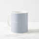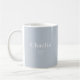 A modern minimalist personalized mug featuring a muted teal background, clean white lettering, and a subtle heart accent. Customized with a name, this design offers a calm, contemporary take on Valentine’s Day gifting while remaining perfect for everyday use.