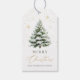 Share the beauty of the season with this elegant Christmas gift tag featuring a single snowy pine tree with a soft green watercolor back side background, and gold snowy details