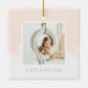 Dekorieren Sie Ihren Weihnachtsbaum mit unserem speziellen Keepsake minimalistisch rot rosa ombre & Schneeflocke zwei Foto Keramik Ornamente. Das Design zeichnet sich durch ein gepflegtes und modernes Foto-Design auf beiden Seiten aus, mit blass-rot-rosa Orange und fallendem Snowflake-Design. Personalisieren Sie die Vorder- und Rückseite mit Ihren speziellen Fotos und Namen.