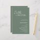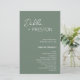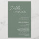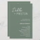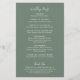 Modernes Olivgrün / Salbeigrün Hochzeitsprogramm mit einem einfachen und minimalen Design mit dem Namen der Braut in einem eleganten Drehbuch und dem Bräutigam in einem zeitgenössischen Sans Serif Schriftart. Unten unten rechts finden Sie Ihre Veranstaltungsdetails und die Reihenfolge der Zeremonie in einem minimalistischen Layout. Der Rücken hat Ihre Hochzeitsfeier und danke Ihnen Nachricht.