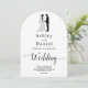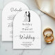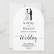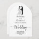 Diese elegante Schwarzweiß-Bogenhochzeit lädt zu einer modernen Hochzeit ein. Das einfache Design zeichnet sich durch eine elegante schwarze Kalligraphie und eine Braut- und Bräutigam-Illustration auf einem sauberen, weißen Hintergrund aus. Die Einladungskarte enthält die Hochzeitsdetails auf der Rückseite, anstatt für eine separate Kapselkarte zu bezahlen.