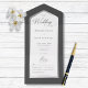 MIT ODER OHNE QR-CODE ODER ABENDESWÄHLUNGSOPTIONEN. Dieses Design hat einen schwarzen Holzkohle Hintergrund mit einem weißen Textbereich, der in Imitaten silber gerahmt ist. Ein Monogramm mit dem ersten Auftakt der Braut und des Bräutigams auf der Außentafel vervollständigt es. Erstellt von der einfachen Farmhouse Press.