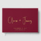 Dieses minimale und elegante bordeauxrote Hochzeitsgast-Buch bietet Ihnen die Wahl zwischen echter Goldfolie, Silber oder Rose, Ihren Namen in einem schicken, modernen Drehbuch und Ihrem Hochzeitsdatum und Ort in klassischer Serifentypografie. Sie können den Titel auf der Wirbelsäule personalisieren und Ihr Lieblings-Foto auf der Rückseite hinzufügen.