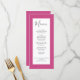 Dieses elegante Hochzeitsmenü besticht durch zeitlose Eleganz, mit einem kühnen massiven fuchsia magenta rosa Hintergrund, der den perfekten Set für Ihre Feier bietet. Ergänzt wird das Design durch ein minimalistisches, stilvolles schwarzes Drehbuch auf einem knalligen weißen Rechteck, wodurch ein schöner Kontrast entsteht, der die Eleganz Ihres Events erhöht. Die schlichte und dennoch raffinierte Gestaltung fügt Ihrem Hochzeitsdekor eine moderne Touch hinzu. Freuen Sie sich auf eine schicke und unvergessliche Art und Weise, Ihr sorgfältig zubereitetes Menü zu präsentieren. Ideal für Paare, die saubere Linien, lebhafte Farben und schlichte Schönheit schätzen, macht dieses Menü eine Aussage, während es den Fokus auf Ihren besonderen Tag behalte.