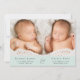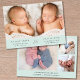 Minimale Minzgrün Junge oder Mädchen Zwillinge Foto Collage Geburt Ankündigung. Die Vorderseite zeigt Foto, Namen, Ankunftsdaten und Geburtsdaten in einfacher, moderner Typografie. Fügen Sie auf der Rückseite drei zusätzliche Fotos und Ihre "Willkommensnachricht" hinzu.