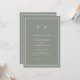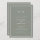 Diese eleganten, modernen und in einer Hochzeitseinladung gestalteten Lounges zeichnen sich durch ein schlichtes, grün-weißes, minimalistisches Textdesign aus, das an der Grenze einen klassischen Rahmen aufweist. Fügen Sie Ihre Initialen oder Monogramme hinzu, um sie komplett zu Ihrem eigenen zu machen. Auf der Rückseite der Einladungen finden Sie Platz für Ihre Hochzeitsdetails (Empfang-Infos, Hotelunterkünfte usw.) und uAwg (einschließlich eines scannable QR-Codes, damit die Gäste online über Ihre Hochzeitswebsite antworten können).