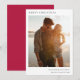 Eine stilvolle minimale Foto-Urlaubskarte mit klassischer Typografie "Frohe Weihnachten" in Schwarz auf einem schlichten, minimalistisch-weißen Hintergrund und einer kräftigen Rottönen auf der Rückseite. Das Foto, der Gruß und der Name können leicht für eine persönliche Touch angepasst werden. Ein einfaches, minimalistisches und zeitgenössisches Weihnachtsdesign, das sich in dieser Urlaubssaison auszeichnet! Das abgebildete Bild dient zur Veranschaulichung, um durch Ihr eigenes Foto ersetzt zu werden. Das Bild der Platzhalter zeigt ein paar Spaziergänge am Strand mit Sonnenuntergang.