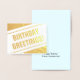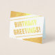 Dieses minimale und einfache Gold-Folie Geburtstag Grußkarte Design beinhaltet die Meldung "BIRTHDAY GREETINGS!" auf der Vorderseite, zusammen mit einer personalisierten Nachricht auf der Innenseite. Es könnte zum Geburtstag von jemandem verwendet werden.