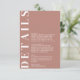 Behalt dein Hochzeitsgeschirr elegant und einfach mit dieser Minimal Wedding Details Einladung. Mit einem sauberen, modernen Layout und zeitloser Typografie eignet sich diese Karte ideal, um alle wichtigen Informationen über Ihren großen Tag zu teilen. Das minimalistische Design sorgt dafür, dass Ihre Details im Mittelpunkt bleiben und dabei jeden Hochzeitsstil ergänzen. Ideal für Paare, die schlichte Eleganz und moderne Ästhetik schätzen.