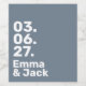 Ein minimalistisches Hochzeitslabel-Design mit einem kühlen grauen Block und fetter weißer Typografie. Das saubere Layout hebt Ihr Hochzeitsdatum und die Namen des Paares in einem modernen, zurückhaltenden Stil hervor. Ideal für zeitgenössische Feiern, schicke Empfänge und stilvolle Tischdekorationen. Einfach, elegant und zeitlos.