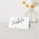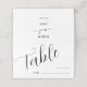 Minimale und einfache Tischnummer Platzkarte für Ihre Hochzeit mit einem modernen Skript-Schriftart, der "Tisch" mit einer Leerzeile, wo Sie die Tischnummer und den Namen des Gastes ausfüllen können. Sie können die Namen der Braut und des Bräutigams auf der Rückseite hinzufügen.