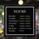 Mit diesem eleganten, modernen Fensterheber können Sie Ihre Öffnungszeiten stilvoll anzeigen. Mit einem minimalen schwarzen Hintergrund und einem sauberen, weißen Text ist dieses benutzerdefinierbare Stundenzeichen perfekt für Cafés, Salons, Boutiquen, Geschäfte und kleine Unternehmen geeignet. Es ist so konzipiert, dass es leicht an den Fenstern festhält, sowohl haltbar als auch beruflich. Es hilft den Kunden, genau zu wissen, wann sie geöffnet sind.