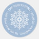Minimale winterbezogene Rundkleber mit individuelle Name und weißer Adresse auf hellblauem Hintergrund mit weißer Blütenschneeflocke. Die Hintergrundfarbe kann auf die jeweilige Designebene angepasst werden. Diese schönen Snowflake-Aufkleber sind ideal, um Ihren Wintermailings oder Verpackungen eine Touch der Festlichkeit hinzuzufügen. Frohe Weihnachten von © y.BEE PAPERIE