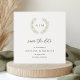 Mit dieser ausgeklügelten "Save the Date" Karte mit minimalem Grünkranz und Monogramm-Design können Sie Ihren ganz besonderen Tag stilvoll verkünden.
