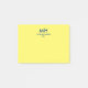 Moderne personalisierte Klebrigstiefe mit den Initialen in tiefblau vor einem hellgelben Hintergrund.