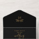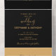 Diese einmalige Hochzeitseinladung besticht durch eine atemberaubende Mischung aus Schwarz und Gold und strahlt eine luxuriöse und extravagante Atmosphäre aus. Oben nehmen die Initialen des Paares die zentrale Bühne, die in einem faszinierenden Kalligraphie-Schriftart aufwändig gestaltet wurde. Unter ihnen liegt ein zarter Vektorzweig, der dem opulenten Design eine Touch der Schönheit der Natur hinzufügt. Die Kombination aus Schwarz und Gold schafft einen fesselnden Kontrast und erhöht die gesamte Einladungspauschale auf ein neues Niveau an Eleganz. Der schwarze Hintergrund dient als kühne Leinwand für den glänzenden Goldtext und verleiht der Gesamtpräsentation ein Gefühl von Drama und Grandeur. Die goldene Schrift strahlt Eleganz aus und ergänzt perfekt das königliche Ambiente des Designs. Um Lesbarkeit und Praktikabilität zu gewährleisten, enthält die RSVP-Karte einen schwarzen Hintergrund mit weißem Text. Dieser gedankenvolle Kontrast ermöglicht es den Gästen, auf die Einladung zu reagieren und dabei das bemerkenswerte Schwarz-Gold-Thema beizubehalten. Der kalligraphische Schriftart mit seinen anmutigen Strichen verbindet sich harmonisch mit einem serifenlosen Schriftart, um ein Gleichgewicht zwischen zeitloser Eleganz und zeitgenössischer Ästhetik zu finden. Zusammenfassend lässt sich sagen, dass das Schwarz-Gold-Farbschema, kombiniert mit aufwändiger Kalligraphie und Vektorbranchendesign, einen unvergesslichen Eindruck hinterlassen und die Bühne für eine außergewöhnliche und unvergessliche Hochzeitsfeier Set.