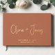 Dieses kleine und elegante Gästebuch aus Terracotta bietet Ihnen die Wahl zwischen echter Goldfolie, Silber oder Rose, Ihren Namen in einem schicken, modernen Drehbuch und Ihren Hochzeitstermin und Ihre Lage in klassischer Serifentypografie.