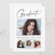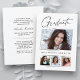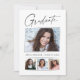 Saubere, minimale, moderne und elegante "4-Foto" Abschluss-Ansichtskarten mit Designelementen moderner Texte mit einem einzigartigen Kalligraphie-Tintenskript. Die Fotos des Absolventen werden mit einem feinen und minimalistischen Gradientenband betont. Die Kartenrückseite bietet personalisierte Textstellen für Informationen über Ihren Abschluss oder können gelöscht werden, wenn Sie eine Nachricht übergeben möchten. Schwarz & Weiß oder einfach den Hintergrund anpassen, um der Grundfarbe Ihrer Schule oder einer beliebigen Farbe Ihrer Wahl zu entsprechen. Perfekt für die Gymnasialstufe, die Uni und den Hochschulstudiengang.