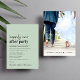Minimal moderne Weise grün Hochzeit/Entfaltung Ankündigung und Empfang Einladung. Die Vorderseite zeigt "Happily Ever After Party" in einem zeitgenössischen Drehbuch und kühne trendige Typografie. Personalisieren Sie Ihre Nachricht und Einladung und fügen Sie Ihre Namen in ein signaturähnliches Skript ein. Auf der Rückseite finden Sie Ihr Foto, Ihre Vornamen und Ihr Hochzeitstermin.