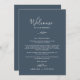 Diese minimalen Blatt Tonschiefer blauen Begrüßungsbriefe & Reisekarten sind perfekt für eine elegante Hochzeit. Die Silhouette ist schlicht und grün in dunkelgraublau mit klassischem minimalistischem Stil. Auf der Vorderseite der Karte befindet sich ein Begrüßungsschreiben, auf der Rückseite der Karte befindet sich der Hochzeitstag. Diese Noten sind ideal für Hochzeiten in Urlaubsort und Begrüßungstaschen für Hotelgäste.